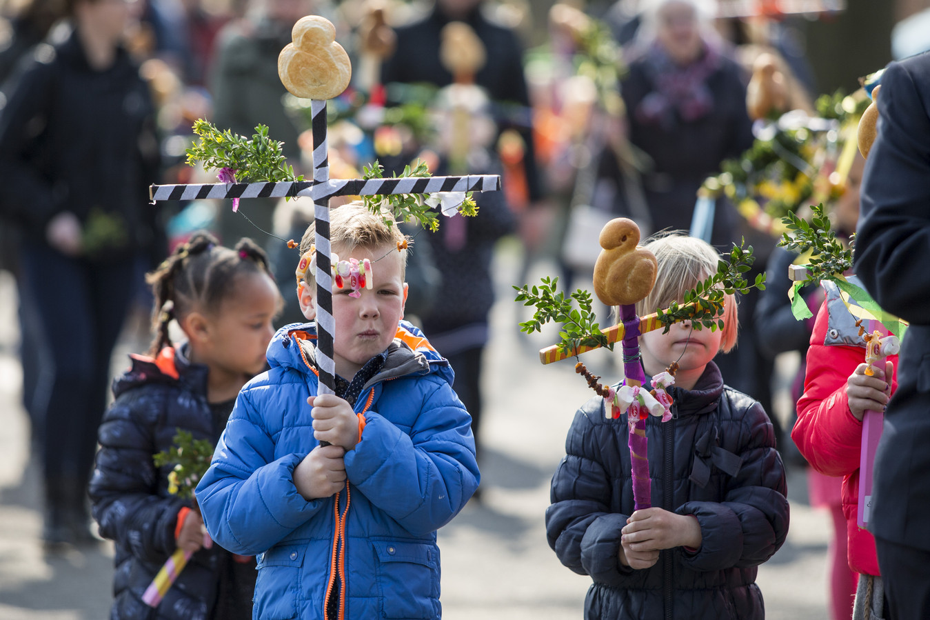 Palmpaasstok - Palm Sunday cross that the children carry . Broodhaantje - Bread cockerel that goes on top of the cross. Which songs will my children sing? Palm-palm-pasen, Hei koerei. Over enen zondag, hebben wij een ei. Een ei is geen ei. Twee ei is een half ei. Drie ei is een paasei. Where can I find more information?